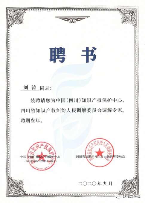 恭喜我司代理人劉濤,受聘成為四川省知識(shí)產(chǎn)權(quán)糾紛人民調(diào)解委員會(huì)調(diào)解專家。