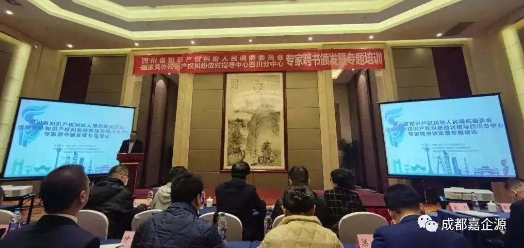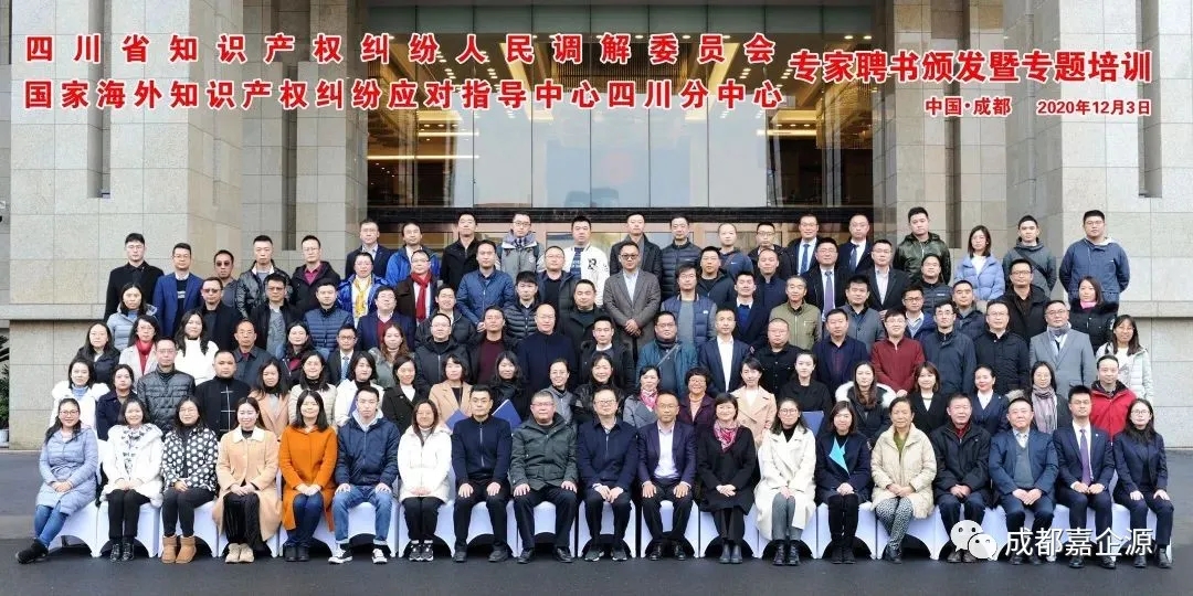 2020年12月3日,由中國(guó)(四川)知識(shí)產(chǎn)權(quán)保護(hù)中心主辦、四川省知識(shí)產(chǎn)權(quán)糾紛人民調(diào)解委員會(huì)承辦的“四川省知識(shí)產(chǎn)權(quán)糾紛人民調(diào)解委員會(huì)調(diào)解專家、國(guó)家海外知識(shí)產(chǎn)權(quán)糾紛應(yīng)對(duì)指導(dǎo)中心四川分中心維權(quán)援助專家聘書頒發(fā)暨專題培訓(xùn)”講座在成都市武侯區(qū)祥宇賓館祥順廳舉行。