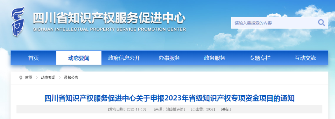 四川省2023年省級(jí)知識(shí)產(chǎn)權(quán)專項(xiàng)資金項(xiàng)目申報(bào)工作申報(bào)工作已啟動(dòng),12月12日截止網(wǎng)報(bào),企業(yè)速看!